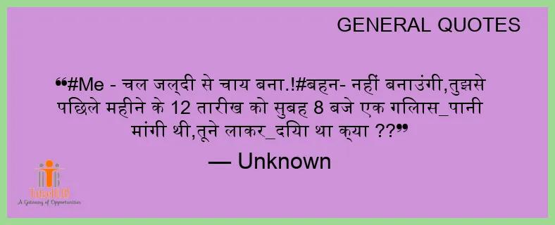 #Me - चल जल्दी से चाय बना.!#बहन- नहीं बनाउंगी,तुझसे पिछले महीने के 12 तारीख को सुबह 8 बजे एक गिलास_पानी मांगी थी,तूने लाकर_दिया था क्या ??