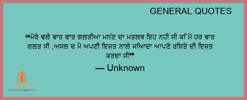 ਮੇਰੇ ਵਲੋ ਵਾਰ ਵਾਰ ਗਲਤੀਆ ਮਨੰਣ ਦਾ ਮਤਲਬ ਇਹ ਨਹੀ ਸੀ ਕਿ ਮੈਂ ਹਰ ਵਾਰ ਗਲਤ ਸੀ ,ਅਸਲ ਚ ਮੈਂ ਅਪਣੀ ਇਜ਼ਤ ਨਾਲੋ ਜਿਆਦਾ ਅਾਪਣੇ ਰਿਸ਼ਤੇ ਦੀ ਇਜ਼ਤ ਕਰਦਾ ਸੀ