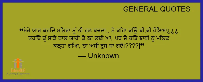 ਮੇਰੇ ਯਾਰ ਕਹਿੰਦੇ ਮਿੱਤਰਾ ਤੂੰ ਨੀ ਹੁਣ ਬਚਦਾ,, ਮੈ ਕਿਹਾ ਕਿਊ ਬੀ,ਕੀ ਹੋਇਆ¿¿¿ ਕਹਿੰਦੇ ਤੂੰ ਸਾਡੇ ਨਾਲ ਯਾਰੀ ਤੇ ਲਾ ਲਈ ਆ, ਪਰ ਜੇ ਕਿਤੇ ਭਾਬੀ ਨੂੰ ਮਿਲਣ ਕਲ੍ਹਾ ਗਿਆ, ਤਾ ਅਸੀਂ ਰੁਸ ਜਾ ਗਏ।????|