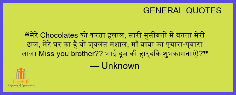 मेरे Chocolates को करता हलाल, सारी मुसीबतों में बनता मेरी ढाल, मेरे घर का है वो ज्वलंत मशाल, माँ बाबा का प्यारा-प्यारा लाल। Miss you brother?? भाई दूज की हार्दिक शुभकामनाएँ!?