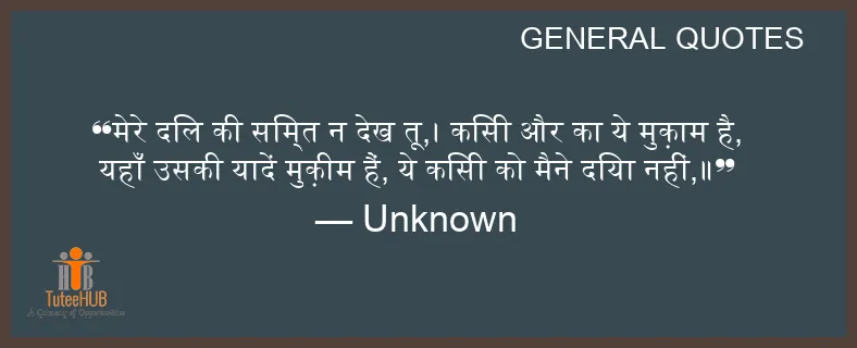 मेरे दिल की सिम्त न देख तू,। किसी और का ये मुक़ाम है, यहाँ उसकी यादें मुक़ीम हैं, ये किसी को मैने दिया नहीं,॥