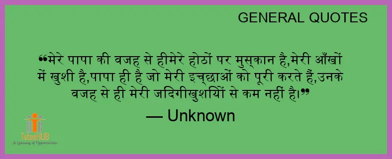 मेरे पापा की वजह से हीमेरे होठों पर मुस्कान है,मेरी आँखों में खुशी है,पापा ही है जो मेरी इच्छाओं को पूरी करते हैं,उनके वजह से ही मेरी जिंदगीख़ुशियों से कम नहीं है।