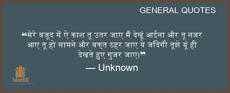 मेरे वजूद में ऐ काश तू उतर जाए मैं देखूं आईना और तू नजर आए तू हो सामने और वक्त ठहर जाए ये जिंदगी तूझे यूं ही देखते हुए गुजर जाए।