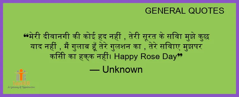 मेरी दीवानगी की कोई हद नहीं , तेरी सूरत के सिवा मुझे कुछ याद नहीं , मैं गुलाब हूँ तेरे गुलशन का , तेरे सिवाए मुझपर किसी का हक्क नहीं। Happy ROSE Day