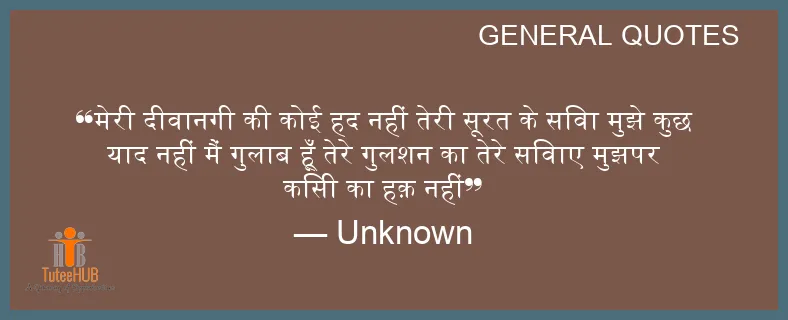 मेरी दीवानगी की कोई हद नहीं तेरी सूरत के सिवा मुझे कुछ याद नहीं मैं गुलाब हूँ तेरे गुलशन का तेरे सिवाए मुझपर किसी का हक़ नहीं