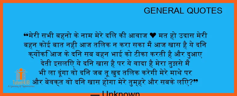 मेरी सभी बहनो के नाम मेरे दिल की आवाज ❤ मत हो उदास मेरी बहन कोई बात नही आज तिलक न करा सका मैं आज खास है ये दिन क्योंकि आज के दिन सब बहन भाई को टीका करती है और दुआए देती इसलिए ये दिन खास है पर ये वादा है मेरा तुझसे मैं भी ला दूंगा वो दिन जब तू खुद तिलक करेगी मेरे माथे पर और बेवक्त वो दिन खास होगा मेरे तुम्हरे और सबके लिए?