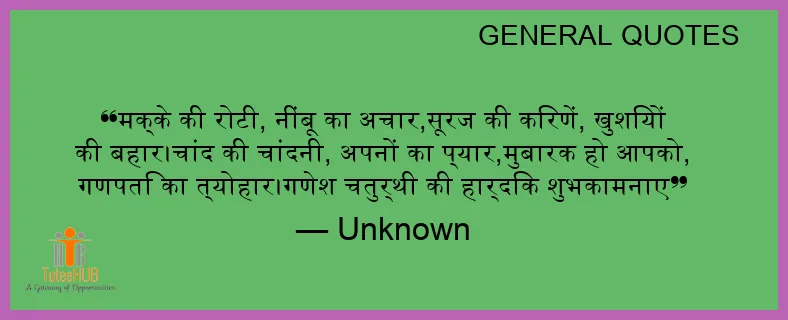 मक्के की रोटी, नींबू का अचार,सूरज की किरणें, खुशियों की बहार।चांद की चांदनी, अपनों का प्यार,मुबारक हो आपको, गणपति का त्योहार।गणेश चतुर्थी की हार्दिक शुभकामनाए
