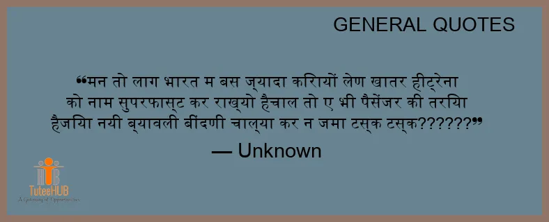 मन तो लाग भारत म बस ज्यादा किरायों लेण खातर हीट्रेना को नाम सुपरफास्ट कर राख्यो हैचाल तो ए भी पैसेंजर की तरिया हैजिया नयी ब्यावली बींदणी चाल्या कर न जमा टस्क टस्क??????
