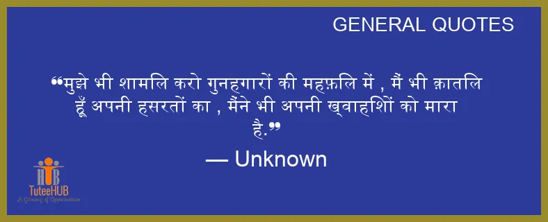 मुझे भी शामिल करो गुनहगारों की महफ़िल में , मैं भी क़ातिल हूँ अपनी हसरतों का , मैंने भी अपनी ख्वाहिशों को मारा है.