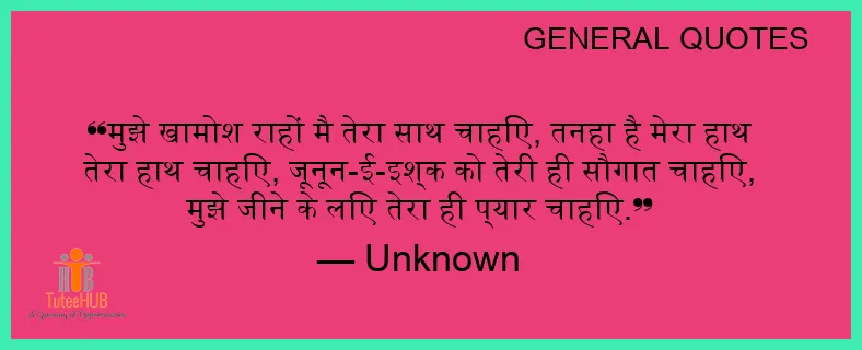 मुझे खामोश राहों मै तेरा साथ चाहिए, तनहा है मेरा हाथ तेरा हाथ चाहिए, जूनून-ई-इश्क को तेरी ही सौगात चाहिए, मुझे जीने के लिए तेरा ही प्यार चाहिए.