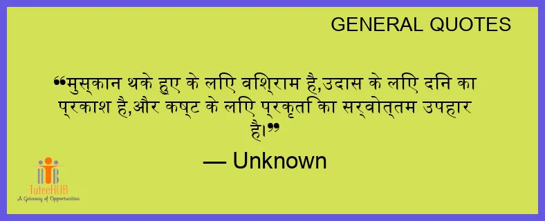 मुस्कान थके हुए के लिए विश्राम है,उदास के लिए दिन का प्रकाश है,और कष्ट के लिए प्रकृति का सर्वोत्तम उपहार है।