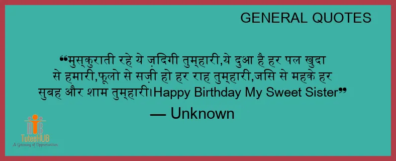 मुस्कुराती रहे ये ज़िंदगी तुम्हारी,ये दुआ है हर पल खुदा से हमारी,फूलो से सज़ी हो हर राह तुम्हारी,जिस से महके हर सुबह और शाम तुम्हारी।Happy Birthday My Sweet Sister