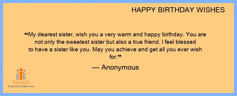 My dearest sister, wish you a very warm and happy birthday. You are not only the sweetest sister but also a true friend. I feel blessed to have a sister like you. May you achieve and get all you ever wish for.