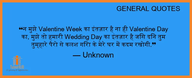 न मुझे Valentine WEEK का इंतज़ार है ना ही Valentine Day का, मुझे तो हमारी Wedding Day का इंतज़ार है जिस दिन तुम तुम्हारे पैरो से कलश गिरा के मेरे घर में कदम रखोगी.