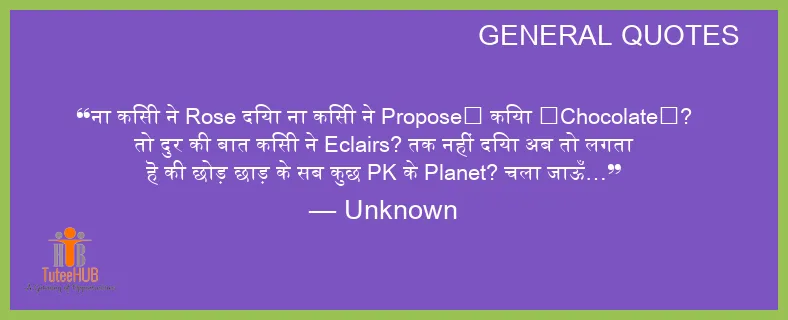 ना किसी ने Rose दिया ना किसी ने Propose‬ किया ‎Chocolate‬? तो दुर की बात किसी ने ECLAIRS? तक नहीं दिया अब तो लगता हॆ की छोड़ छाड़ के सब कुछ PK के PLANET? चला जाऊँ…