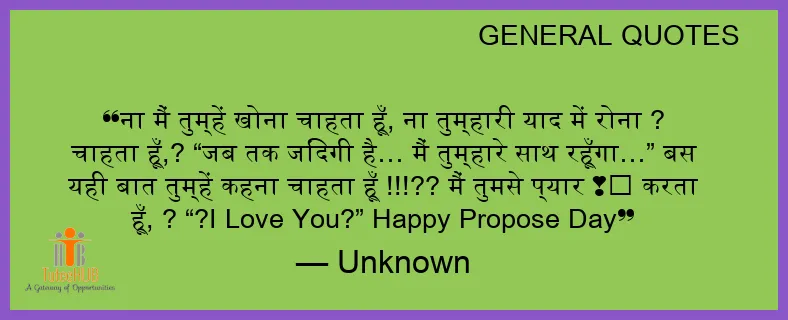 ना मैं तुम्हें खोना चाहता हूँ, ना तुम्हारी याद में रोना ? चाहता हूँ,? “जब तक जिंदगी है… मैं तुम्हारे साथ रहूँगा…” बस यही बात तुम्हें कहना चाहता हूँ !!!?? मैं तुमसे प्यार ❣️ करता हूँ, ? “?I Love You?” Happy Propose Day