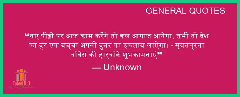 नए पीढ़ी पर आज काम करेंगे तो कल आगाज आयेगा, तभी तो देश का हर एक बच्चा अपनी हुनर का इंकलाब लाऐगा। - स्वतंत्रता दिवस की हार्दिक शुभकामनाएं
