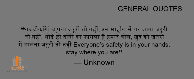 नजदीकियां बढ़ाना जरूरी तो नहीं, इस माहौल में घर जाना जरूरी तो नहीं, थोड़े ही दिनों का फासला है हमारे बीच, खुद को खतरों में डालना जरूरी तो नहीं Everyone’s safety is in your hands. stay where you are
