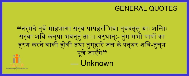 नर्मदे त्वें माहभागा सर्व पापहरि भव। त्वदत्सु याः शिलाः सर्वा शिव कल्पा भवन्तु ताः।। अर्थात्:- तुम सभी पापों का हरण करने वाली होगी तथा तुम्हारे जल के पत्थर शिव-तुल्य पूजे जाएँगे