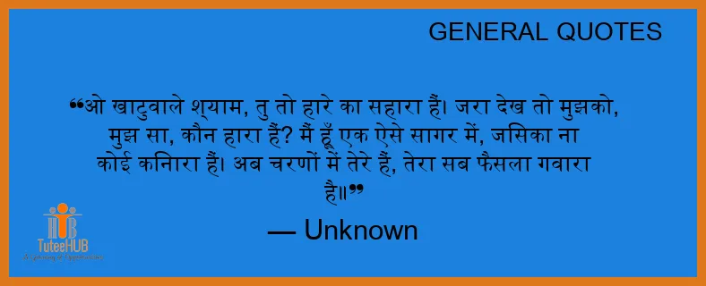 ओ खाटुवाले श्याम, तु तो हारे का सहारा हैं। जरा देख तो मुझको, मुझ सा, कौन हारा हैं? मैं हूँ एक ऐसे सागर में, जिसका ना कोई किनारा हैं। अब चरणों में तेरे हैं, तेरा सब फैसला गवारा है॥