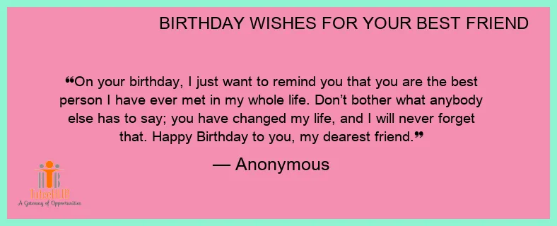 On your birthday, I just want to remind you that you are the best person I have ever met in my whole life. Don’t bother what anybody else has to say; you have changed my life, and I will never forget that. Happy Birthday to you, my dearest friend.