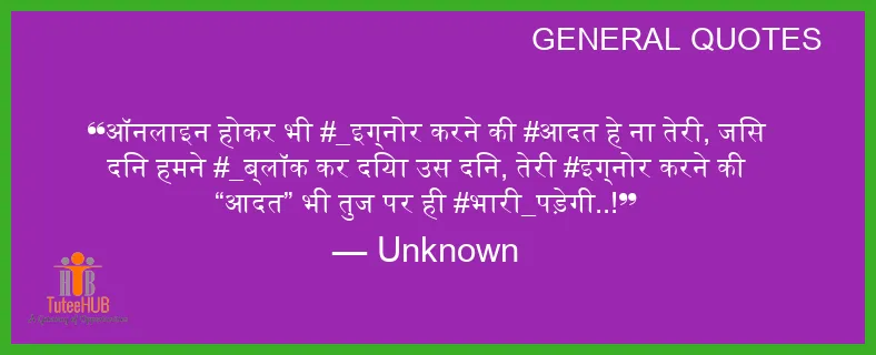 ऑनलाइन होकर भी #_इग्नोर करने की #आदत हे ना तेरी, जिस दिन हमने #_ब्लॉक कर दिया उस दिन, तेरी #इग्नोर करने की “आदत” भी तुज पर ही #भारी_पड़ेगी..!