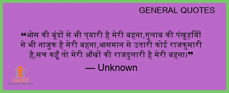 ओस की बूंदों से भी प्यारी है मेरी बहना,गुलाब की पंखुड़ियों से भी नाज़ुक है मेरी बहना,आसमान से उतारी कोई राजकुमारी है,सच कहूँ तो मेरी आँखों की राजदुलारी है मेरी बहना।