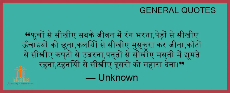 फूलों से सीखीए सबके जीवन में रंग भरना,पेड़ों से सीखीए ऊँचाइयों को छूना,कलियों से सीखीए मुस्कुरा कर जीना,काँटों से सीखीए कष्टों से उबरना,पत्तों से सीखीए मस्ती में झूमते रहना,टहनियों से सीखीए दूसरों को सहारा देना।