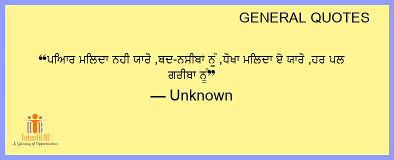 ਪਿਆਰ ਮਿਲਦਾ ਨਹੀਂ ਯਾਰੋ ,ਬਦ-ਨਸੀਬਾਂ ਨੂੰ ,ਧੋਖਾ ਮਿਲਦਾ ਏ ਯਾਰੋ ,ਹਰ ਪਲ ਗਰੀਬਾ ਨੂੰ