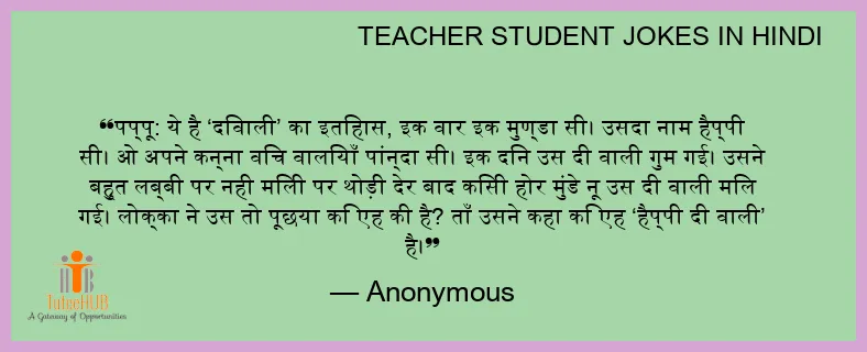 पप्पू: ये है ‘दिवाली’ का इतिहास, इक वार इक मुण्डा सी। उसदा नाम हैप्पी सी। ओ अपने कन्ना विच वालियाँ पांन्दा सी। इक दिन उस दी वाली गुम गई। उसने बहुत लब्बी पर नही मिली पर थोड़ी देर बाद किसी होर मुंडे नू उस दी वाली मिल गई। लोक्का ने उस तो पूछया कि एह की है? ताँ उसने कहा कि एह ‘हैप्पी दी वाली’ है।
