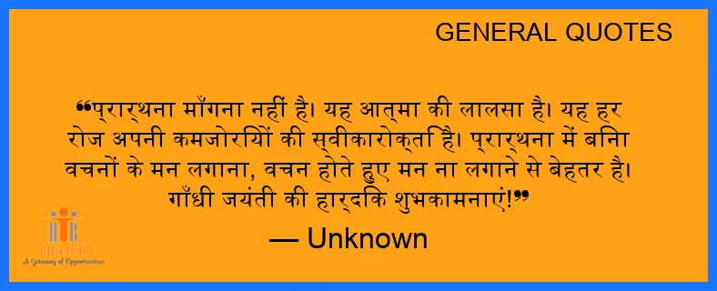 प्रार्थना माँगना नहीं है। यह आत्मा की लालसा है। यह हर रोज अपनी कमजोरियों की स्वीकारोक्ति है। प्रार्थना में बिना वचनों के मन लगाना, वचन होते हुए मन ना लगाने से बेहतर है। गाँधी जयंती की हार्दिक शुभकामनाएं!