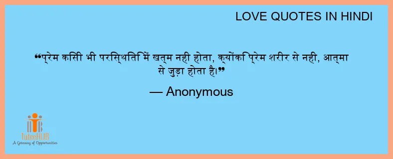 प्रेम किसी भी परिस्थिति में खत्म नही होता, क्योंकि प्रेम शरीर से नही, आत्मा से जुड़ा होता है।