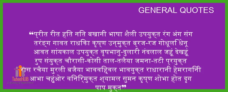 प्रीत रीत हित नित बखानी भाषा शैली उपयुक्त रंग अंग संग तरंङ्ग गावत राधिका कृष्ण उन्मुक्त ब्रज-रज गोधूलि धेनू आवत सांयकाल उपयुक्त वृषभानु-दुलारी नंदलाल जहूं देखहूं रुप संयुक्त चौरासी-कोसी ताल-तलैया जमना-तटी प्रयुक्त रास रचैया मुरली बजैया भावविह्वल भावयुक्त राधारानी हेमरागिनी आभा चहुंओर विनिर्मुक्त श्यामल सुमन कृष्ण शोभा होत दृग पाप मुक्त