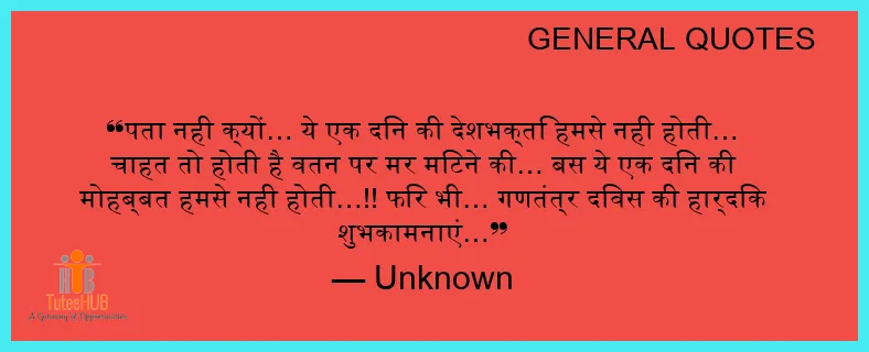 पता नही क्यों… ये एक दिन की देशभक्ति हमसे नही होती… चाहत तो होती है वतन पर मर मिटने की… बस ये एक दिन की मोहब्बत हमसे नही होती…!! फिर भी… गणतंत्र दिवस की हार्दिक शुभकामनाएं…