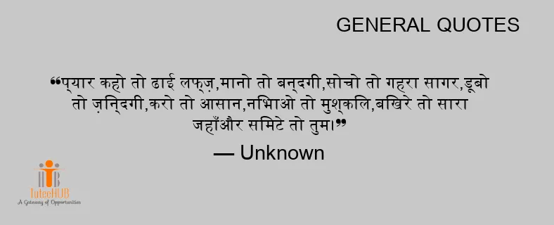 प्यार कहो तो ढाई लफ्ज़,मानो तो बन्दगी,सोचो तो गहरा सागर,डूबो तो ज़िन्दगी,करो तो आसान,निभाओ तो मुश्किल,बिखरे तो सारा जहाँऔर सिमटे तो तुम।