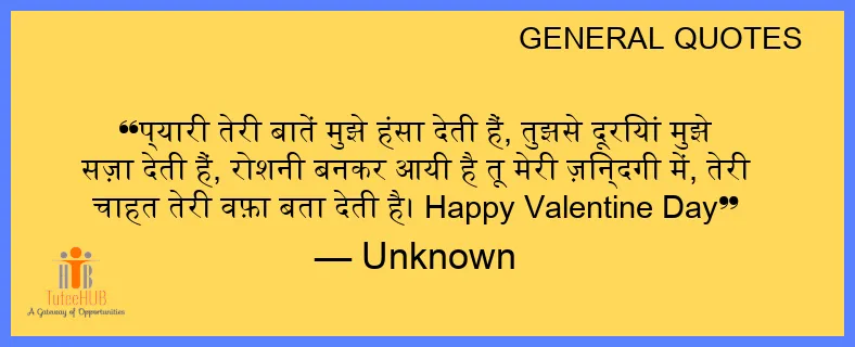 प्यारी तेरी बातें मुझे हंसा देती हैं, तुझसे दूरियां मुझे सज़ा देती हैं, रोशनी बनकर आयी है तू मेरी ज़िन्दगी में, तेरी चाहत तेरी वफ़ा बता देती है। HAPPY Valentine DAY