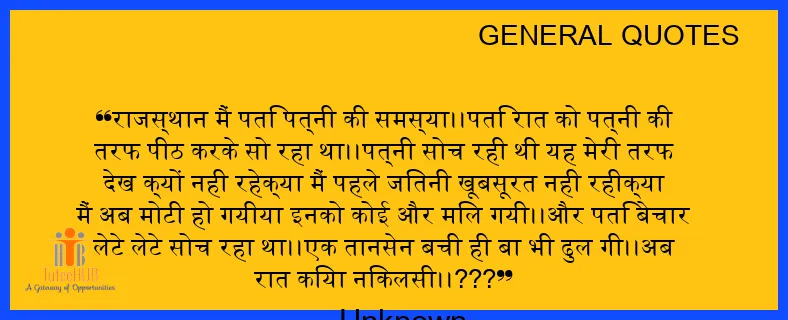 राजस्थान मैं पति पत्नी की समस्या।।पति रात को पत्नी की तरफ पीठ करके सो रहा था।।पत्नी सोच रही थी यह मेरी तरफ देख क्यों नही रहेक्या मैं पहले जितनी खूबसूरत नही रहीक्या मैं अब मोटी हो गयीया इनको कोई और मिल गयी।।और पति बेचार लेटे लेटे सोच रहा था।।एक तानसेन बची ही बा भी ढुल गी।।अब रात किया निकलसी।।???
