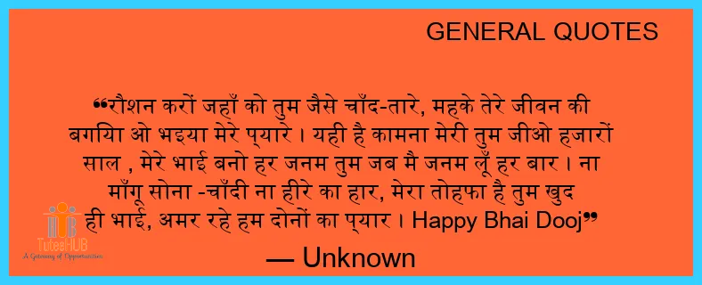 रौशन करों जहाँ को तुम जैसे चाँद-तारे, महके तेरे जीवन की बगिया ओ भइया मेरे प्यारे । यही है कामना मेरी तुम जीओ हजारों साल , मेरे भाई बनो हर जनम तुम जब मै जनम लूँ हर बार । ना माँगू सोना -चाँदी ना हीरे का हार, मेरा तोहफा है तुम खुद ही भाई, अमर रहे हम दोनों का प्यार । Happy Bhai Dooj