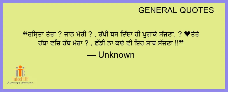 ਰਿਸ਼ਤਾ ਤੇਰਾ ? ਜਾਨ ਮੇਰੀ ? , ਰੱਖੀ ਬਸ ਇੱਦਾ ਹੀ ਪੁਗਾਕੇ ਸੱਜਣਾ, ? ❤ਤੇਰੇ ਹੱਥਾ ਵਿੱਚ ਹੱਥ ਮੇਰਾ ? , ਛੱਡੀ ਨਾ ਕਦੇ ਵੀ ਇਹ ਸਾਥ ਸੱਜਣਾ !!