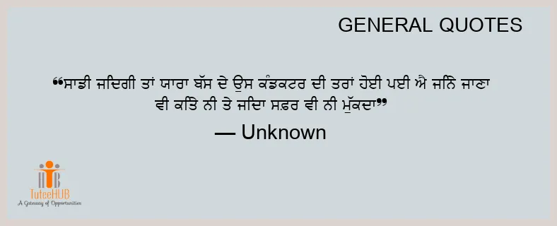 ਸਾਡੀ ਜਿੰਦਗੀ ਤਾਂ ਯਾਰਾ ਬੱਸ ਦੇ ਉਸ ਕੰਡਕਟਰ ਦੀ ਤਰਾਂ ਹੋਈ ਪਈ ਐ ਜਿੰਨੇ ਜਾਣਾ ਵੀ ਕਿਤੇ ਨੀ ਤੇ ਜਿਦਾ ਸਫ਼ਰ ਵੀ ਨੀ ਮੁੱਕਦਾ