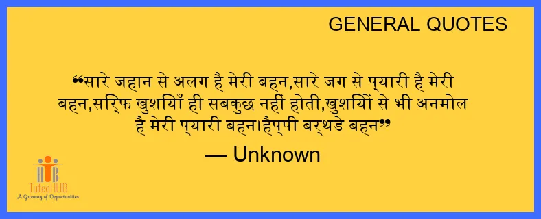 सारे जहान से अलग है मेरी बहन,सारे जग से प्यारी है मेरी बहन,सिर्फ खुशियाँ ही सबकुछ नहीं होती,खुशियों से भी अनमोल है मेरी प्यारी बहन।हैप्पी बर्थडे बहन