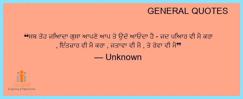 ਸਬ ਤੋਹ ਜਿਆਦਾ ਗੁਸਾ ਆਪਣੇ ਆਪ ਤੇ ਉਦੋ ਆਓਂਦਾ ਹੈ - ਜਦ ਪਿਆਰ ਵੀ ਮੈ ਕਰਾ , ਇੰਤਜ਼ਾਰ ਵੀ ਮੈ ਕਰਾ , ਜਤਾਵਾ ਵੀ ਮੈ , ਤੇ ਰੋਵਾ ਵੀ ਮੈ