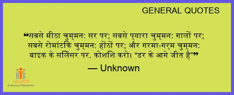 सबसे मीठा चुम्मन: सर पर; सबसे प्यारा चुम्मन: गालों पर; सबसे रोमांटिक चुम्मन: होंठों पर; और गरमा-गर्म चुम्मन: बाइक के सिलेंसर पर. कोशिश करो। “डर के आगे जीत है”