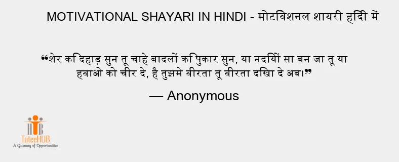 शेर कि दहाड़ सुन तू चाहे बादलों कि पुकार सुन, या नदियों सा बन जा तू या हवाओ को चीर दे, है तुझमे वीरता तू वीरता दिखा दे अब।