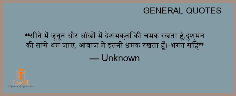 सीने में जूनून और आँखों में देशभक्ति की चमक रखता हूँ,दुश्मन की सांसे थम जाए, आवाज में इतनी धमक रखता हूँ।-भगत सिंह