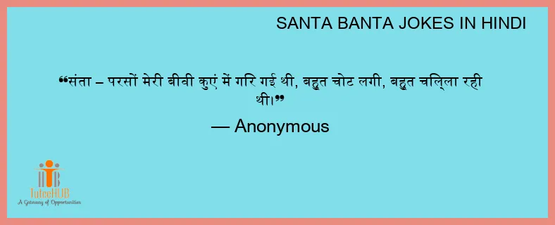संता – परसों मेरी बीवी कुएं में गिर गई थी, बहुत चोट लगी, बहुत चिल्ला रही थी।