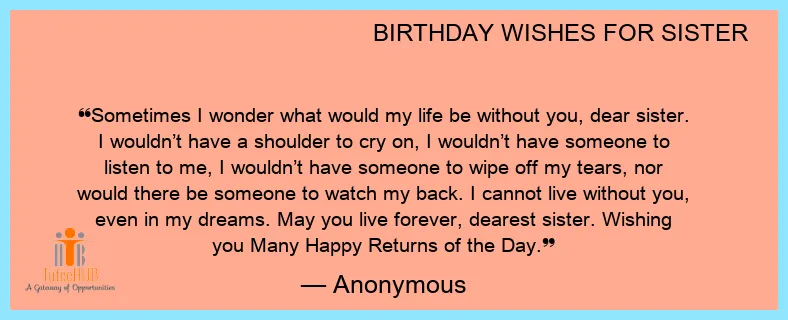 Sometimes I wonder what would my life be without you, dear sister. I wouldn’t have a shoulder to cry on, I wouldn’t have someone to listen to me, I wouldn’t have someone to wipe off my tears, nor would there be someone to watch my back. I cannot live without you, even in my dreams. May you live forever, dearest sister. Wishing you Many Happy Returns of the Day.