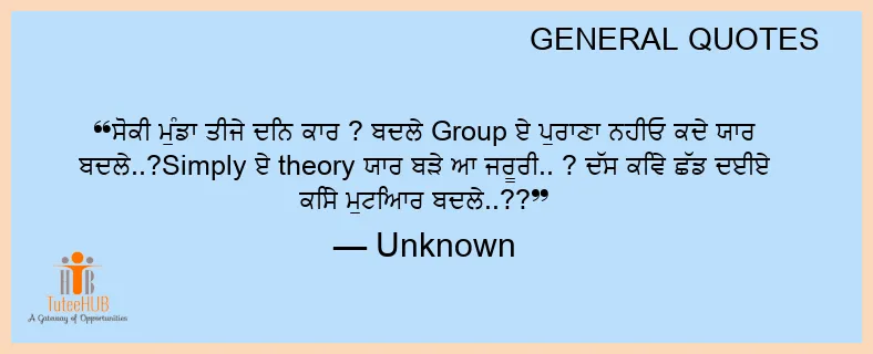 ਸੋਕੀ ਮੁੰਡਾ ਤੀਜੇ ਦਿਨ ਕਾਰ ? ਬਦਲੇ Group ਏ ਪੁਰਾਣਾ ਨਹੀਓ ਕਦੇ ਯਾਰ ਬਦਲੇ..?Simply ਏ theory ਯਾਰ ਬੜੇ ਆ ਜਰੂਰੀ.. ? ਦੱਸ ਕਿਵੇ ਛੱਡ ਦਈਏ ਕਿਸੇ ਮੁਟਿਆਰ ਬਦਲੇ..??