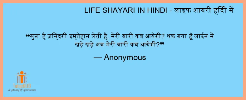 सुना है ज़िन्दगी इम्तेहान लेती है, मेरी बारी कब आयेगी? थक गया हूँ लाईन में खड़े खड़े अब मेरी बारी कब आयेगी?