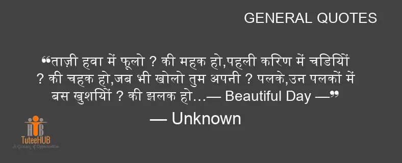 ताज़ी हवा में फूलो ? की महक हो,पहली किरण में चिडियों ? की चहक हो,जब भी खोलो तुम अपनी ? पलके,उन पलकों में बस खुशियों ? की झलक हो…— Beautiful Day —